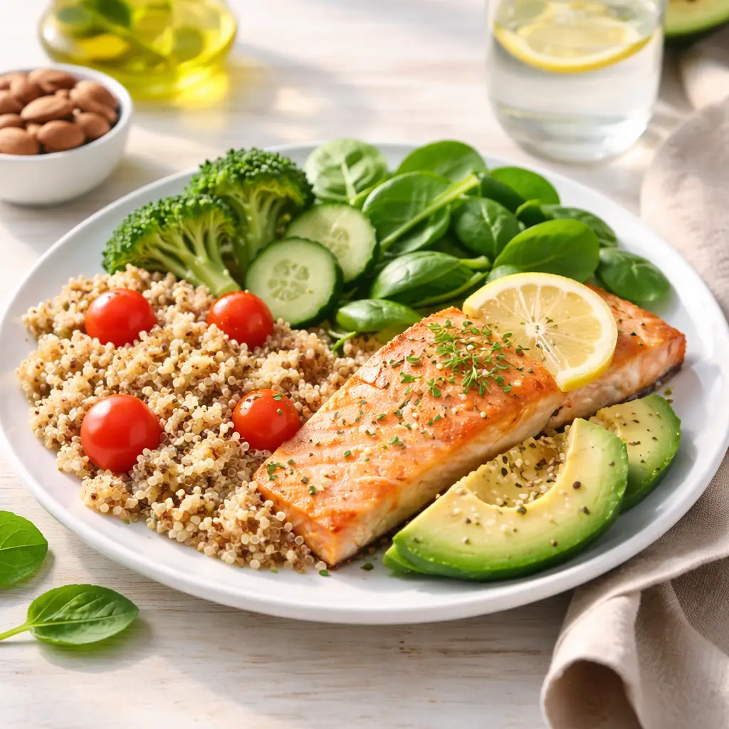 Nutrição na Menopausa com alimentos naturais como peixe, vegetais verdes, sementes e oleaginosas para equilíbrio hormonal